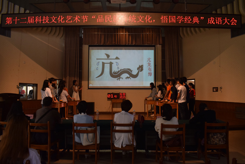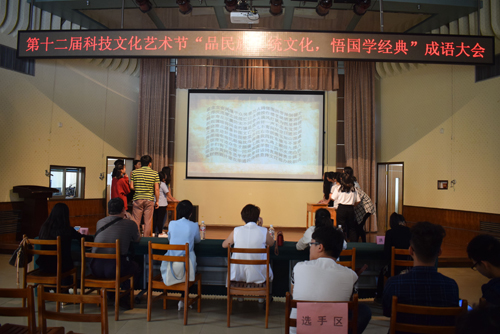 2017年4月28日,工商管理系在学院图书馆多功能厅成功举办了以“品民族传统文化,悟国学经典”为主题的第十二届文化艺术节成语大赛决赛。