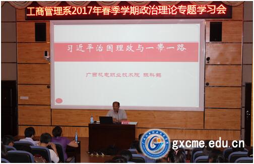 为进一步深入开展“两学一做”学习教育,提高党员、教师及广大团员的政治理论水平, 5月26日下午,学院党委副书记、纪委书记陈科鹤以“习近平治国理政与‘一带一路’”为题,为我院工商管理系全体教师、入党积极分子、学生党员和班级团员干部代表讲授了一堂生动的专题党课。