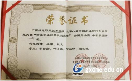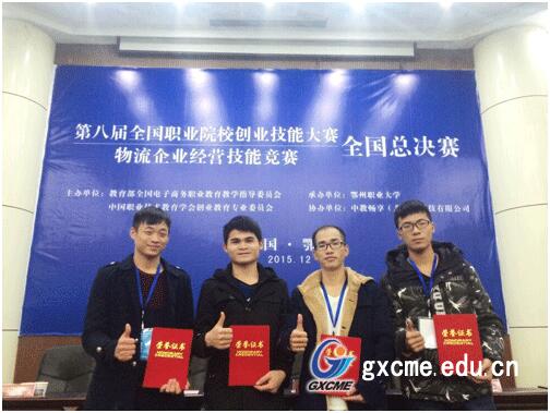 近日,第八届全国职业院校创业技能比赛——物流企业经营技能竞赛全国总决赛在湖北举行。来自全国81所高职院校的139支代表队参加了角逐。由我院工商管理系梁军、赵凡老师组成的教师代表队获教师组二等奖;由物流专业李付勋、叶海龙、宁必铮、阙宗斌组成的学生代表队夺得学生组一等奖。这是我院物流管理专业首次在此项全国大赛中获一等奖,实现了历史性的突破。