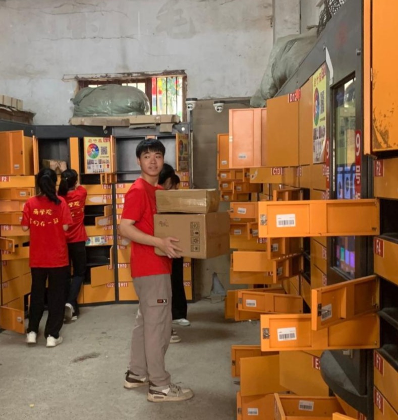 分拣过程中,每一位参与到志愿服务的同学根据不同分工要求,穿梭在排排货架间,执行包裹的搬运、分拣、录入、摆放、入柜、协助取件等工作,从最初的手忙脚乱到后来的有条不紊,全身心投入到工作中。