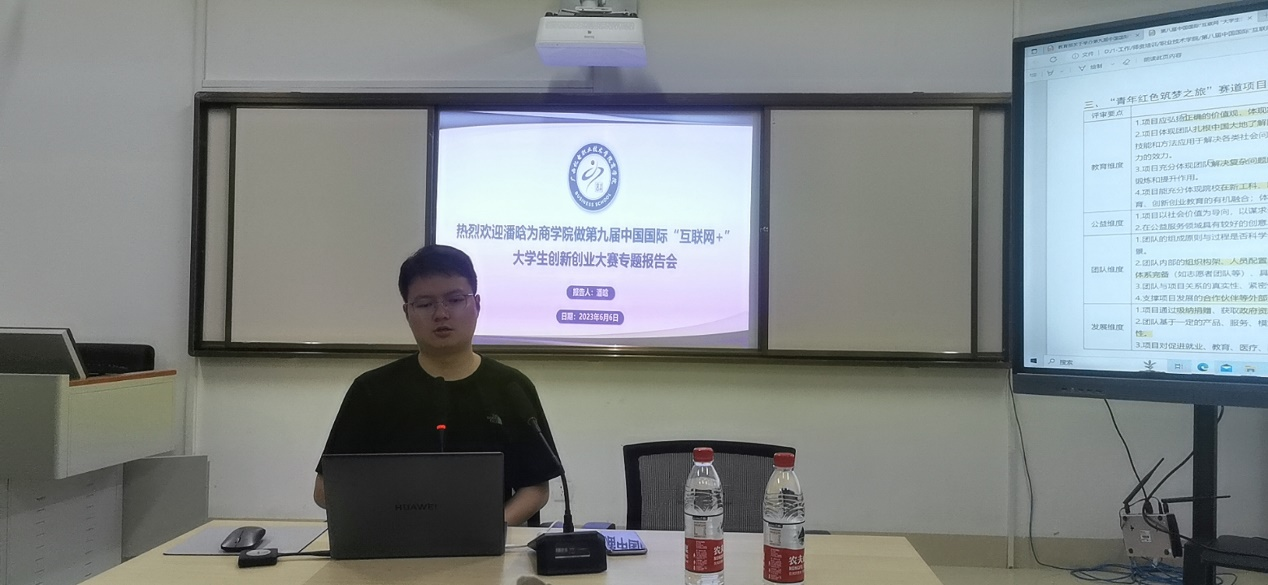 报告会邀请了中国国际“互联网+”大学生创新创业大赛国赛评委、重庆万学创世教育科技有限公司大区总经理潘晗先生为商学院的师生们做了一场生动而富有实践指导意义的报告。