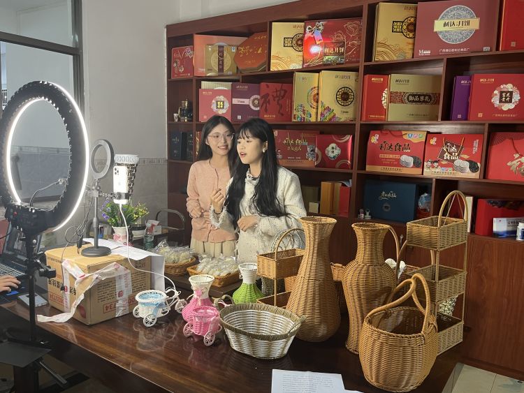 在顿谷镇利达食品厂,一场电商直播带货活动正在举行。来自awc77万象城官网商学院的学生面对直播镜头,积极宣传顿谷镇的风土人情和产业发展情况,详细地向观众介绍利达米饼和芒竹编工艺成品,场下老师更是细心的在现场为企业员工开展电商直播培训,将学习成果与乡村振兴有效衔接,助推顿谷镇产业发展,助力乡村振兴。