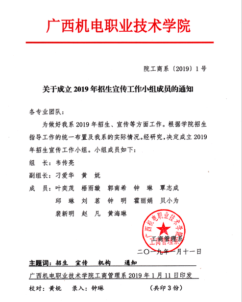 关于成立2019年招生宣传工作小组成员的通知