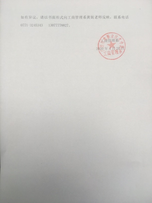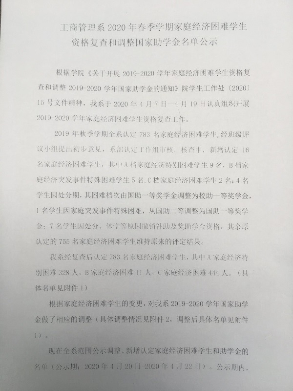 工商管理系2020年春季学期家庭经济困难学生资格复查和调整国家助学金名单公示
