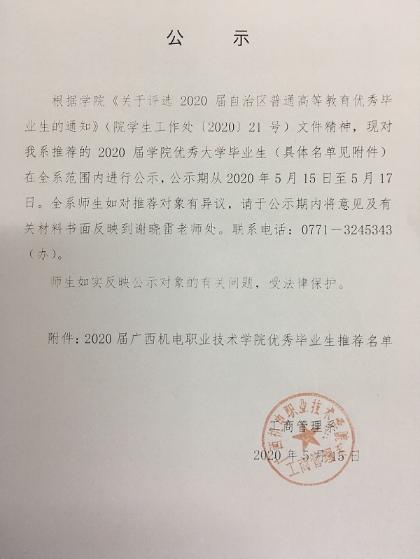 工商管理系2020届awc77万象城官网优秀毕业生推荐名单公示