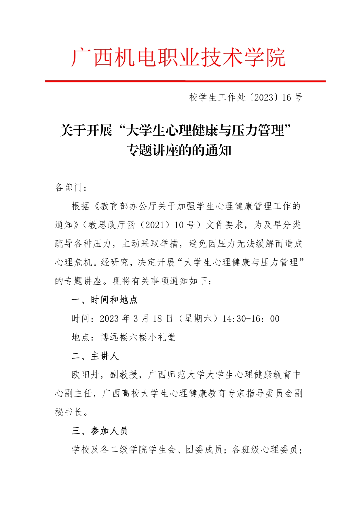 关于开展“大学生心理健康与压力管理”专题讲座的的通知