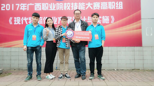 左起:李瑜伦、韦晓锶、郑巨庆、覃志成(指导老师)、韦圣 2017年4月13日-14日,在由广西教育厅和广西人社厅主办,广西职业技术学院承办的广西职业院校技能大赛——“高职组《现代物流作...