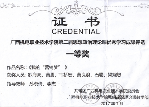 近期,由院团委和思想政治理论课教学部共同举办的第二届思想政治理论课优秀学习成果评选结果揭晓,工商管理系营销与策划协会的罗海亮、黄勇等6名同学制作的微电影《我的营销梦》喜获得一等奖...