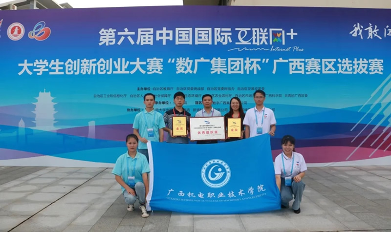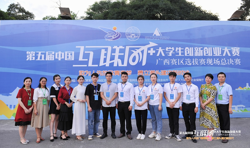 (2020年第六届中国国际互联网+大学生创新创业大赛广西区选拔赛金奖项目学生代表与指导老师合影)