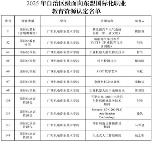 此次获认定的项目精准对接中国—东盟区域产业发展需求,创新融合先进技术、多语种教学与实践培训模式,充分彰显了学校在新能源汽车、智能制造、人工智能、材料工程等前沿领域的教学资源建设实力。