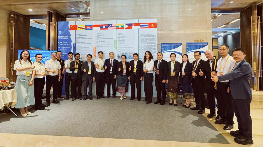 刘捷(左三)与老挝驻华大使馆教育文化参赞苏提达及中外嘉宾合影