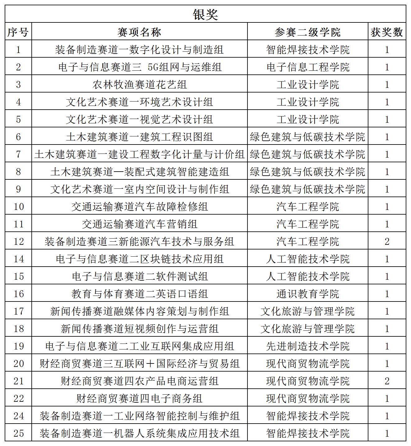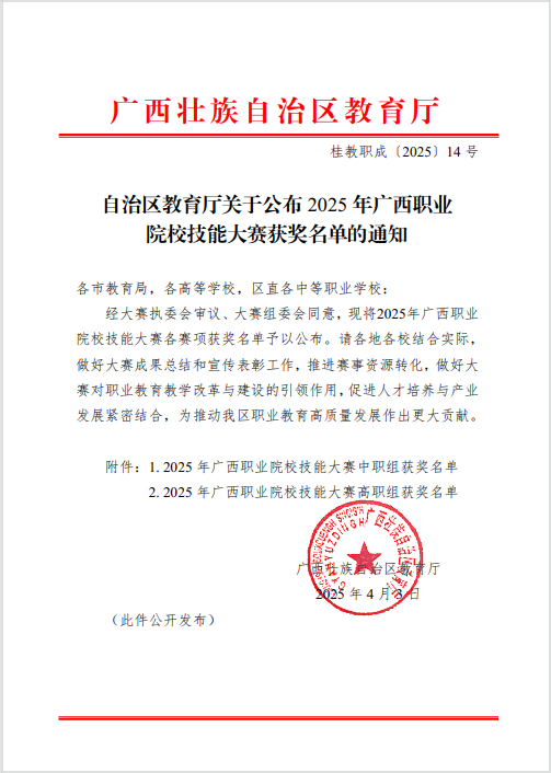 近日,2025年广西职业院校技能大赛圆满落幕,根据《自治区教育厅关于公布2025年广西职业院校技能大赛获奖名单的通知》,万象城官网师生发挥出色,表现优异,获得金奖12个,银奖25个,铜奖25个,合计62个奖项。