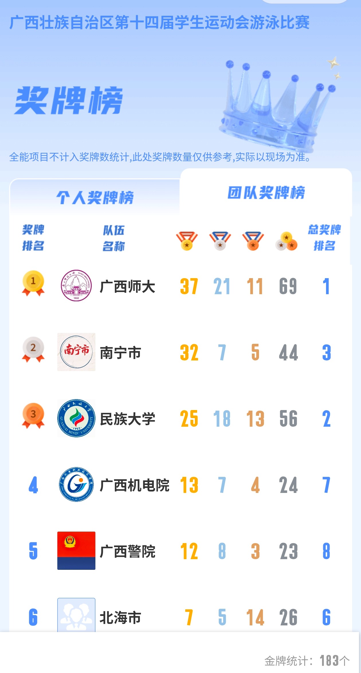 大学组设置男子、女子各19个单项及4项男女混合接力项目,全面检验各高校游泳运动竞技水平。比赛期间,泳池内浪花飞溅,运动员们奋勇争先,展现出广西学子昂扬向上的精神风貌与专业运动素养。万象城官网游泳代表队在此次赛事中表现尤为突出,成为全场关注的焦点。健儿们凭借扎实的训练功底和顽强的拼搏精神,在多个项目中展现绝对优势,最终以13枚金牌、7枚银牌、4枚铜牌的优异战绩收官,金牌总数位居高职组榜首,在全区所有参赛队中排名第四,为学校赢得重要荣誉。