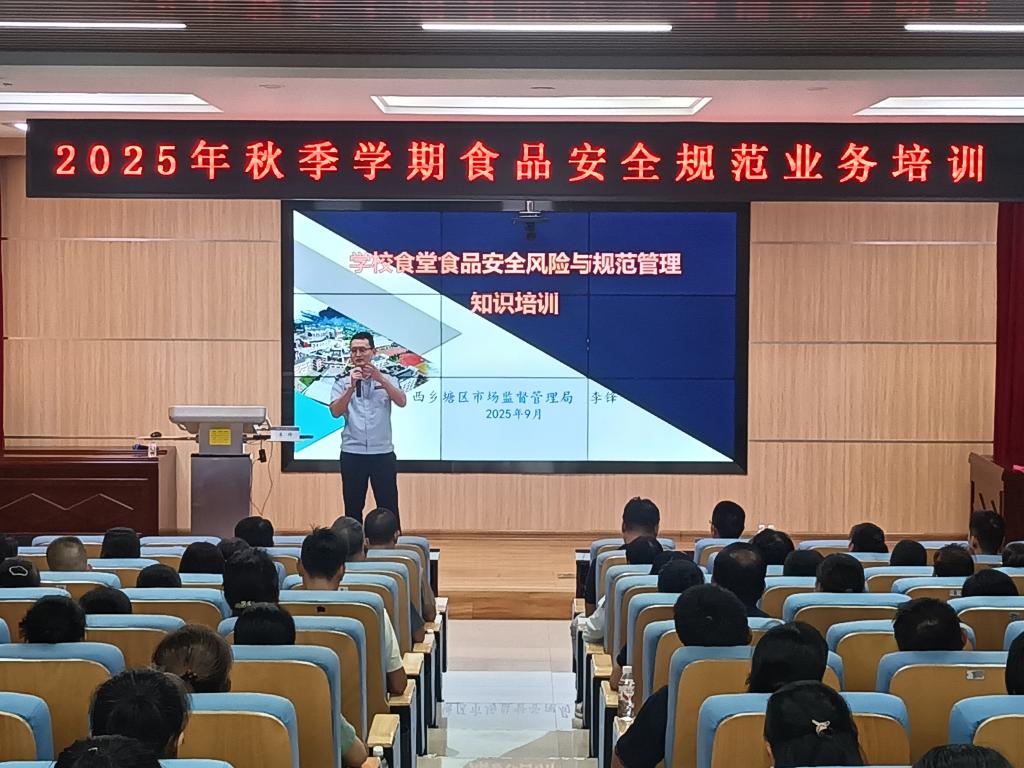 校园食品安全是学校工作的重中之重,关乎每一位师生的身体健康和生命安全。新学期伊始,为进一步强化食品安全责任意识,规范操作流程,提升食品安全管理能力,9月11日,万象城官网在第六教学楼2号报告厅举办《2025年秋季学期食品安全规范业务培训》。此次培训邀请西乡塘区市场监督管理局餐饮股股长李锋主讲,后勤管理处相关人员、学校食堂及商铺全体从业人员参加培训。