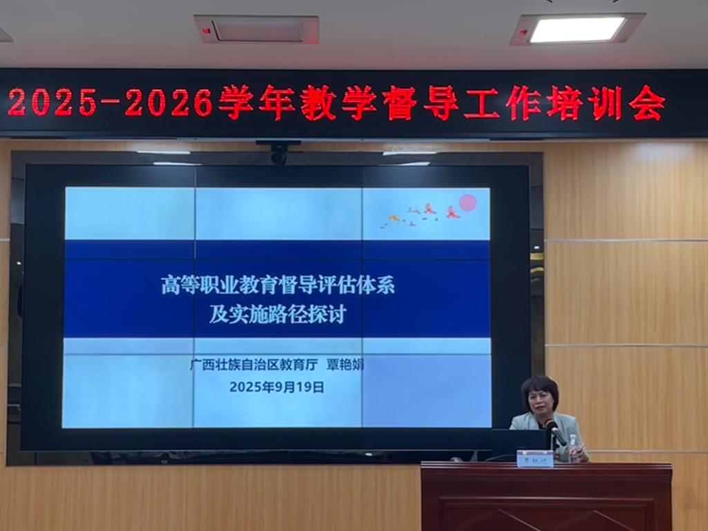 本次2025-2026学年教学督导工作培训会特别邀请了自治区教育厅副总督学、自治区人民政府教育督导委员会办公室常务副主任覃艳娟博士作专题讲座。覃艳娟博士以“高等职业教育督导评估体系及实施路径探讨”为题,结合实际情况,深入分析了新时代背景下教学督导工作的使命与方向,系统解读了高等职业学校办学能力评价指标体系。她强调,要坚持以OBE教育理念为引领,推动督导工作实现从“经验判断”向“标准引领”、从“聚焦教师”向“聚焦学生”的深刻转变。面对数字化赋能督导创新的大趋势,全体督导员要努力做到“讲政治、敢担当、懂教育”,不断提升专业能力,切实履行好教学质量建设者与守护者的使命,为学校人才培养质量提升提供坚实保障。