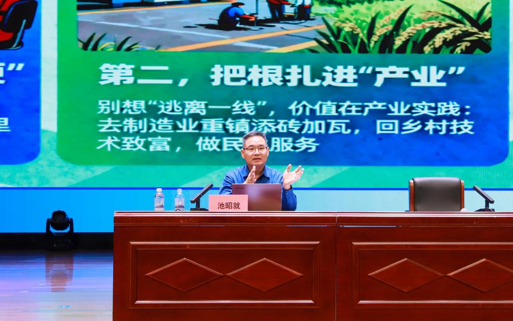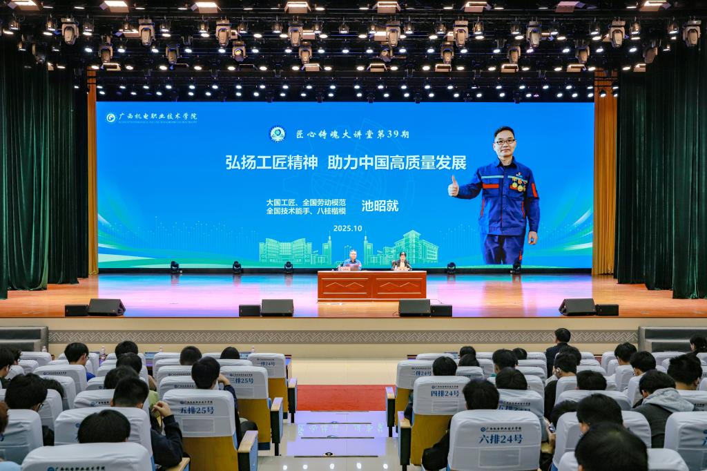 10月23日晚,“匠心铸魂大讲堂”(第39期)“大国工匠”池昭就专题报告会在弘毅楼大礼堂举行。2002级数控技术与装备专业杰出校友、“大国工匠”池昭就重返母校,与师生分享其匠心之路与创新实践。学校领导、各部门负责人及师生代表共同聆听了报告。