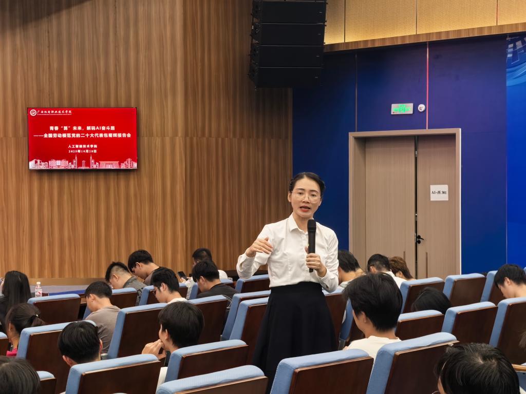 包菊辉现任北海高新区海洋产业联合党支部书记、广西正五海洋产业股份有限公司、北海佰佳人力资源有限公司、广西华控供应链有限公司人力行政总监、工会主席。她在民营企业从事基层工作20年,从一名普通职工成长为全国劳动模范、全国优秀工会工作者、全国巾帼标兵,当选党的二十大代表。报告会上,包菊辉以自身20余年基层奋斗经历为切入点,围绕“弘扬劳模精神,解码AI奋斗路”主题,从“但行好事”“AI时代关联密码”“要问前程”“以匠心赴未来”四个维度展开分享,为在场师生带来了一场兼具思想深度与实践价值的精神盛宴。