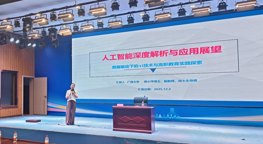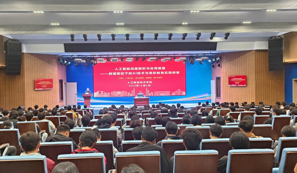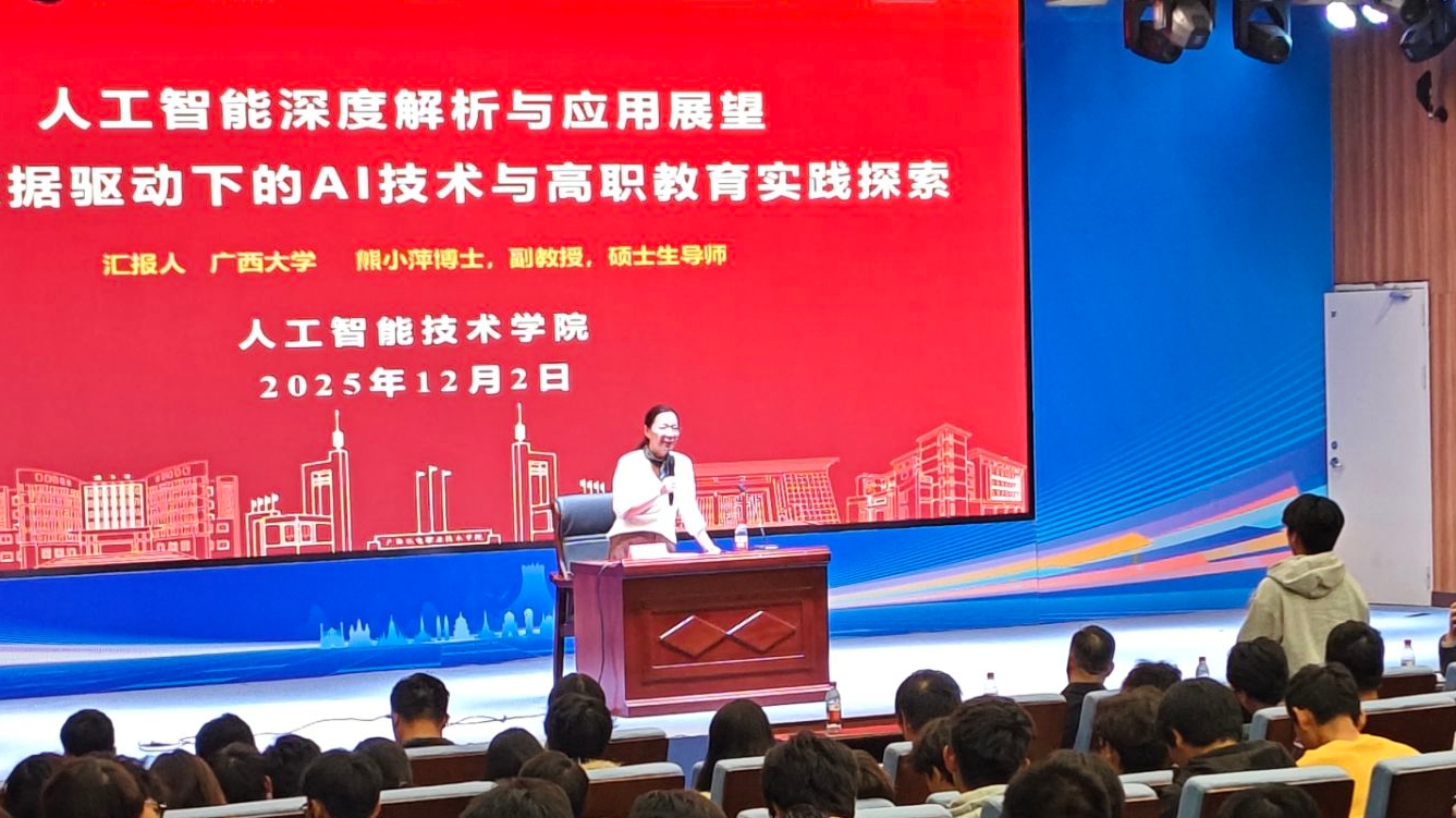 12月2日晚,由万象城官网人工智能技术学院主办,高瞻技能大师工作室承办的“人工智能深度解析与应用展望——数据驱动下的AI技术与高职教育实践探索”专题报告会在江南校区A1栋三楼报告厅举行。本次报告会特邀广西大学副教授、硕士生导师熊小萍博士主讲。人工智能技术学院师生代表300多人参加报告会,在思想碰撞中探寻AI时代职业教育育人新路径。
