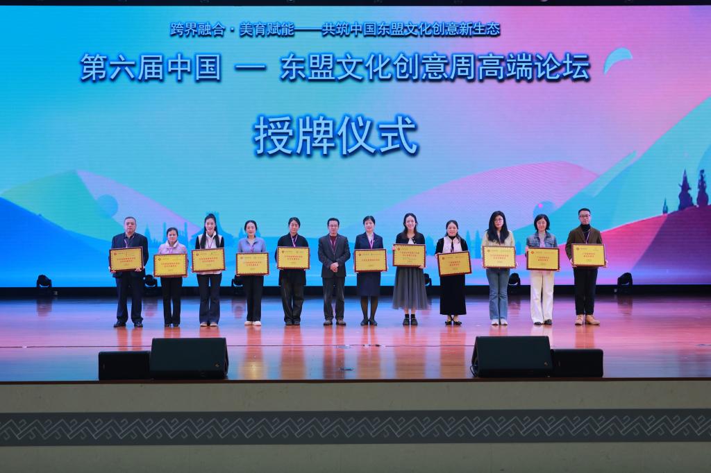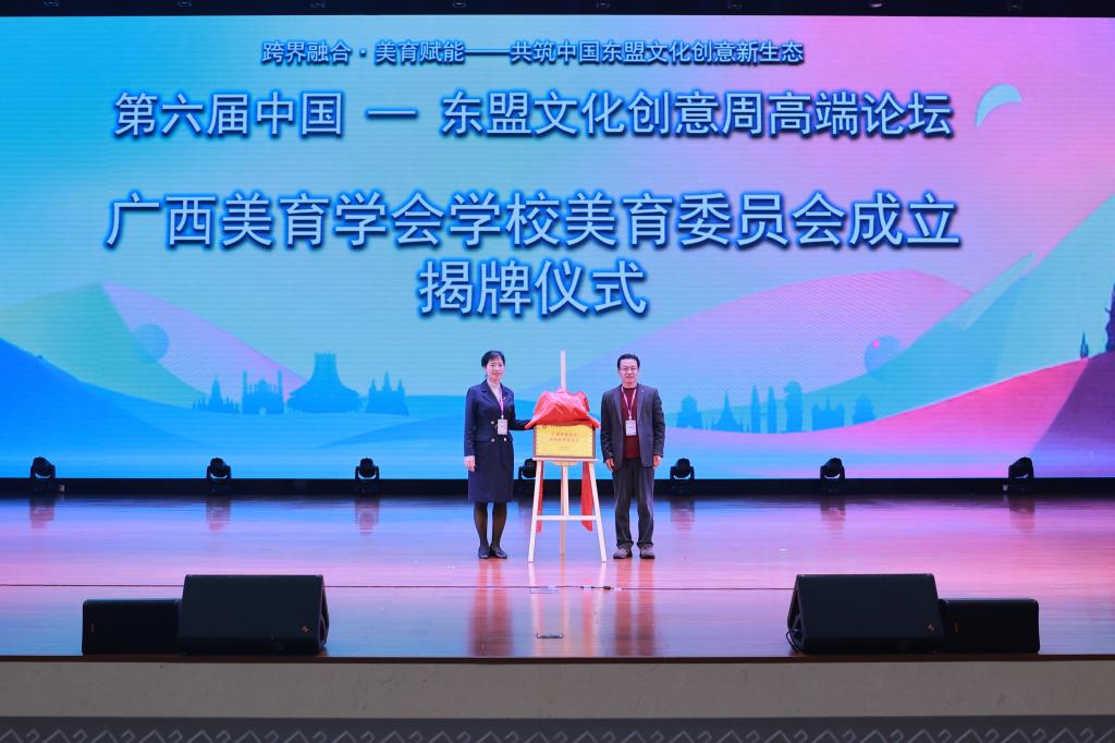 开幕式现场还举行了广西美育学会学校美育委员会成立揭牌仪式,为新聘委员会专家、顾问、主席等颁发聘书,为示范性美育特色学校、高水平美育工作室等代表授牌,为第六届中国—东盟文化创意周高端论坛优秀论文、案例获奖者颁发证书。系列仪式不仅是对广西美育优秀实践成果的肯定,更搭建起“产学研用”协同推进的美育发展平台,为后续工作开展注入强劲动力。