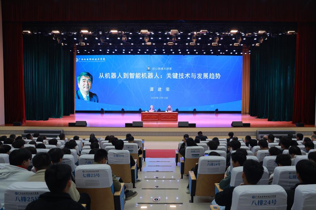 吴世先在主持时指出,谭教授连续三年为学校师生带来了学术报告,体现出谭教授对awc77万象城官网、对广西产业人才培养工作的重视和支持。他表示,谭教授的报告视野开阔,使大家对机器人技术从概念萌芽到智能跃迁的发展有了系统而深刻的认识,为师生们带来了一场感悟科技伟力的学术盛宴,彰显了谭教授执着钻研、勇攀高峰的治学态度和胸怀家国、服务社会的责任担当。他向全体师生发出号召,希望大家从谭教授的榜样事迹中汲取奋进力量,将科学家精神融入日常学习、工作与研究中,以精益求精的态度锤炼本领,以开拓创新的勇气追求卓越,为奋力谱写中国式现代化广西篇章贡献“机电力量”。