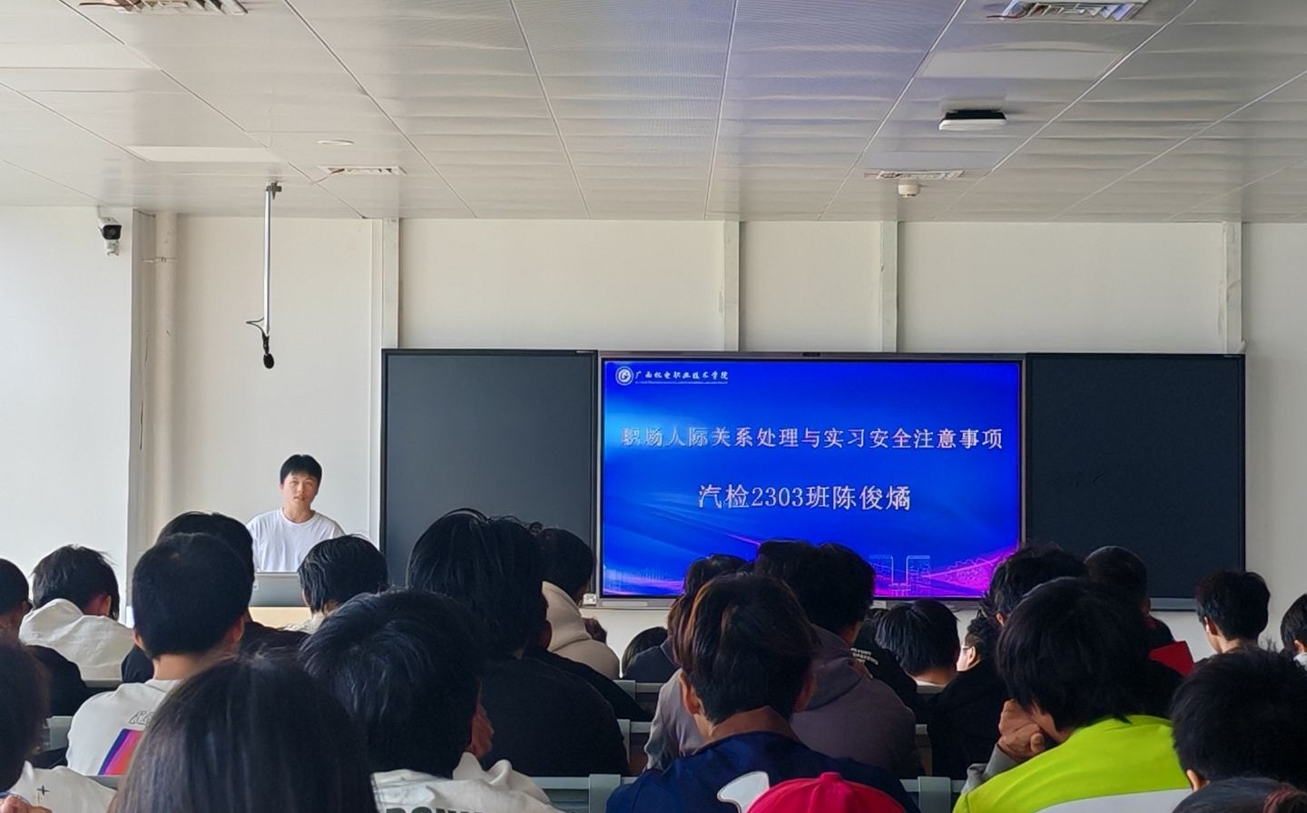 在江南校区A1-404教室,4名优秀毕业班学生代表聚焦实习全流程,带来针对性分享:新能源2305班张振林同学梳理了企业官网、校内推荐等实习信息渠道,并现场演示简历优化技巧;汽检2301班卢涛杰同学结合实操案例,讲解办公软件高阶用法、行业工具操作等专业技能提升路径,以及任务拆解、跨部门协作的通用能力培养方法;汽检2303班陈俊燏同学从工作汇报、职场礼仪等人际交流技巧,延伸到通勤安全、防范实习诈骗等安全要点,覆盖实习期间的潜在需求;新能源2303班张经浩同学则以模板为例,详解实习报告结构框架和材料提交规范,解决同学们实习收尾不知如何做的困惑。在“实习模拟咨询”环节,毕业班的学长们结合学弟学妹们的个人意向,提供个性化参考建议,让低年级同学对实习有了进一步的清晰认识,帮助他们明确了行动方向。