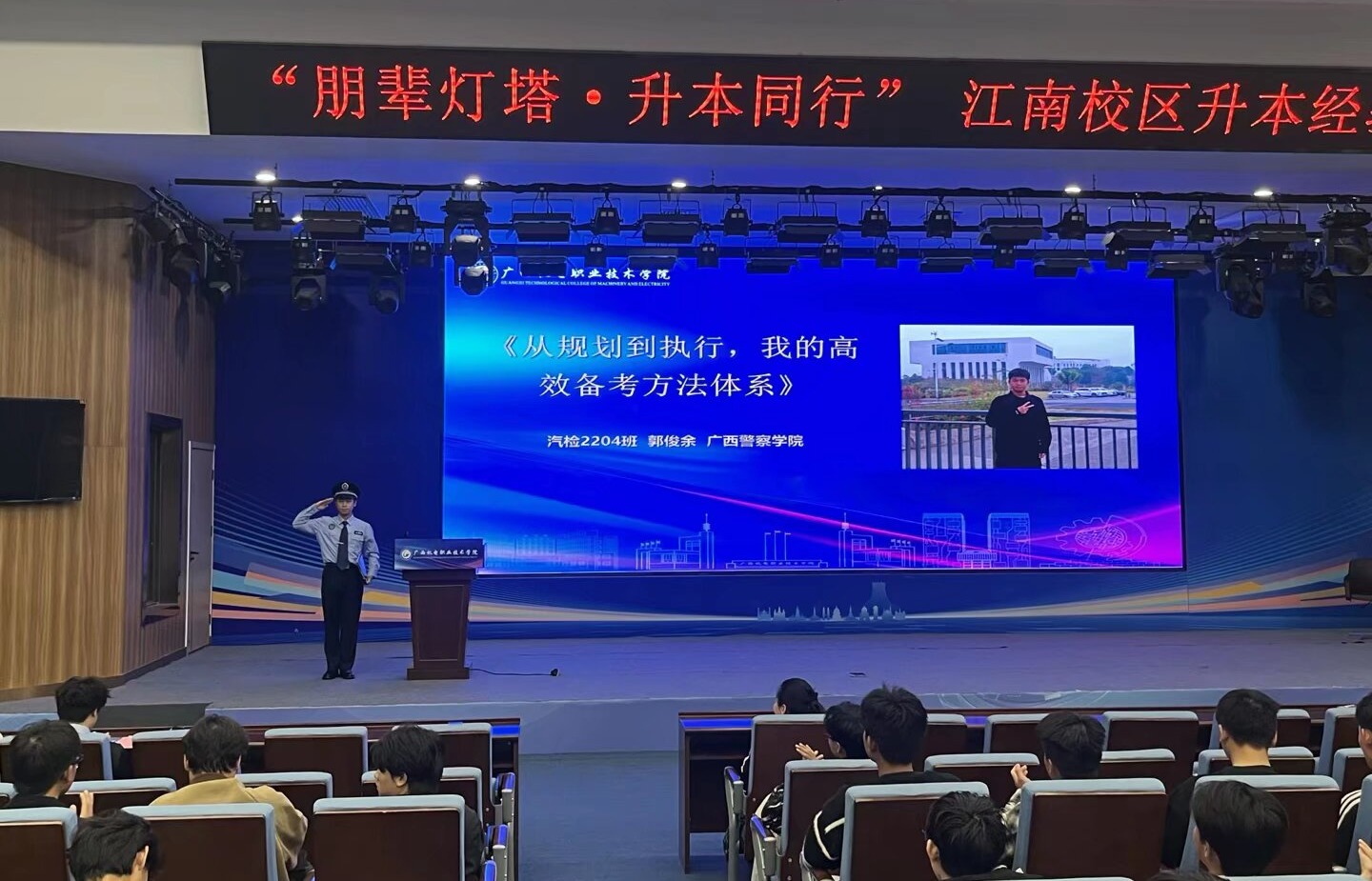 活动邀请成功升入本科学校的优秀校友在江南校区报告厅,为2024级有升本意向的学生量身定制“朋辈灯塔·升本同行”经验交流会。来自广西警察学院的郭俊余(原汽检2204班)、南宁学院的姚云怡(原新能源2201班)、广西农业职业技术大学的盘坤(原新能源2202班)等三名优秀校友结合自身的备考经历和感悟,分别从“专升本院校选择的优先级考量”“公共课刷题技巧与专业课笔记整理方法”“备考焦虑调节的时间管理策略”等分享各自专升本实战策略、实用技巧及成功经验,并针对现场学弟学妹们的升本疑惑进行面对面的交流和细心解答。与会的不少同学表示,学长们分享的“分阶段复习计划”“真题利用方法”极具操作性,有效地缓解了备考焦虑,也为大家明确了复习方向。