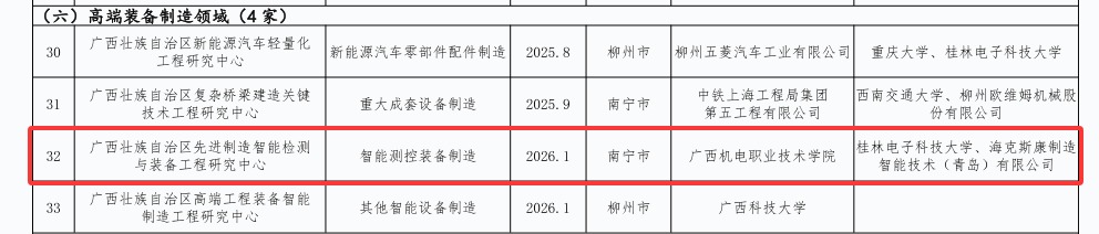 近日,广西壮族自治区发展和改革委员会印发《2025年度广西壮族自治区工程研究中心认定名单及评价结果的通知》,认定46家自治区工程研究中心。由万象城官网牵头,联合桂林电子科技大学、海克斯康制造智能技术(青岛)有限公司申报的“广西壮族自治区先进制造智能检测与装备工程研究中心”成功获批,万象城官网也成为了同时拥有三家工程研究中心的高职院校,标志着万象城官网在自治区级高水平科研创新平台建设上取得了又一重要突破。