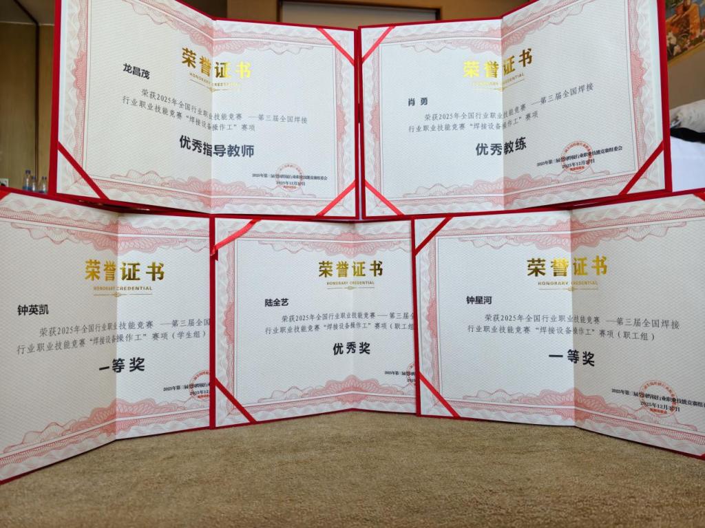 岁末传捷报,蓄力启新程。此次年终岁尾的荣誉加冕,既是学校深化“岗课赛证”综合育人改革的显著成效,也是师生践行工匠精神、深耕技能领域的生动写照。站在2025与2026的时间交汇点上,智能焊接技术学院将以这份沉甸甸的荣誉为起点,继续弘扬劳模精神、劳动精神、工匠精神,深化产教融合、校企合作,在新的一年里持续培育更多高素质技能人才,为焊接行业高质量发展与技能强国建设注入源源不断的职教力量。