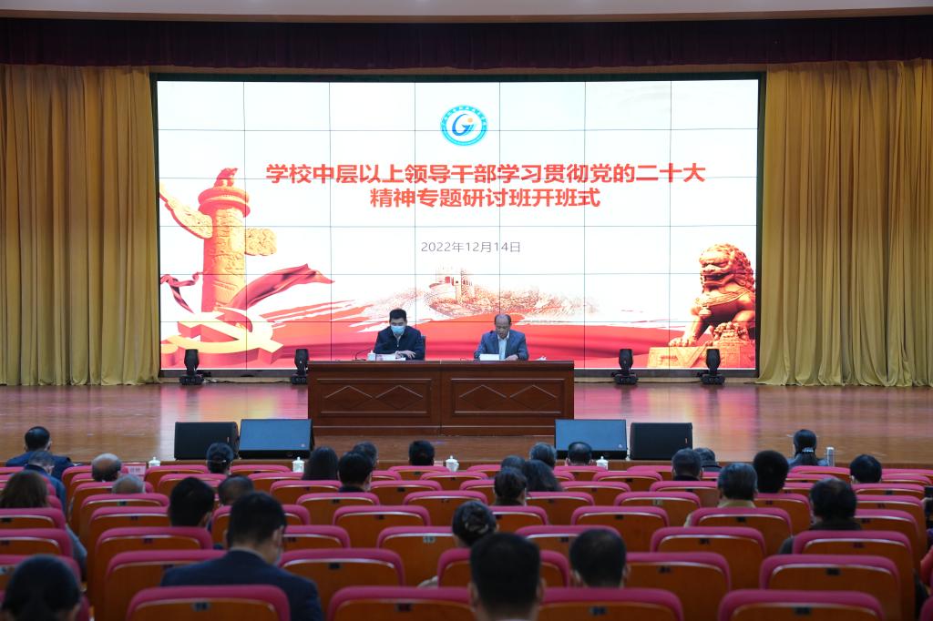 12月14日下午,学校中层以上领导干部学习贯彻党的二十大精神专题研讨班在博远楼小礼堂开班。校党委书记黄小敬作开班动员讲话,全体校领导出席开班式,党委副书记陈科鹤主持开班式。