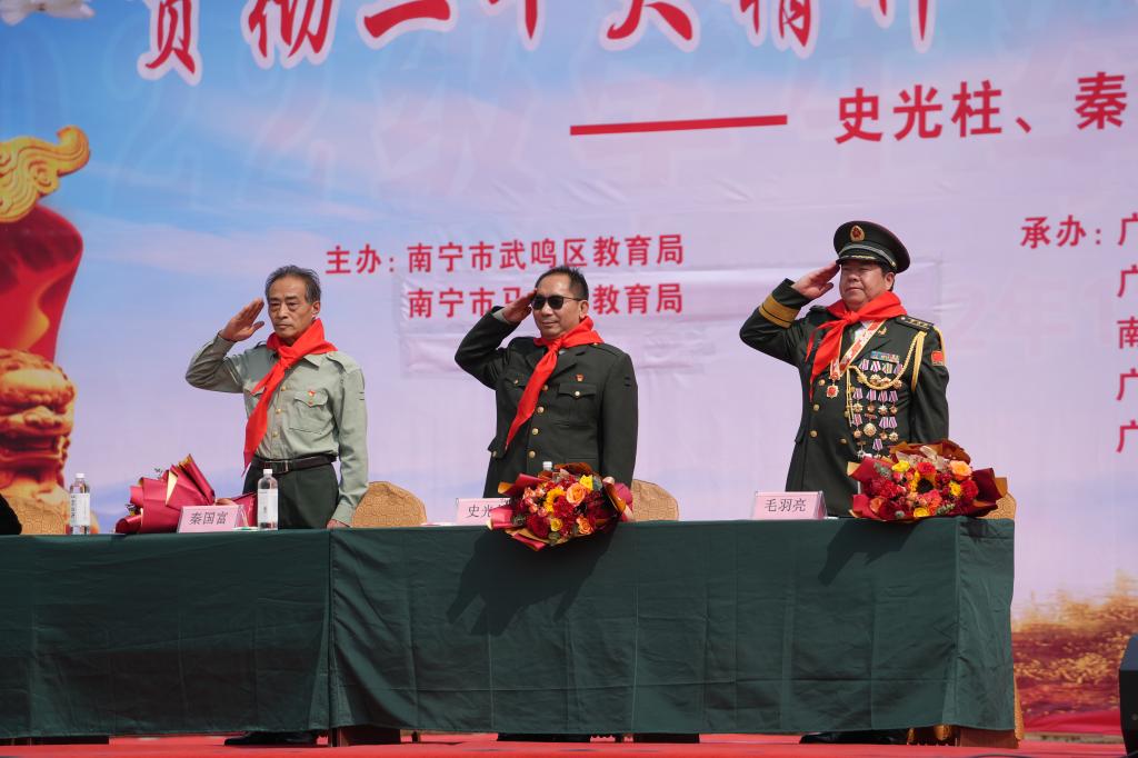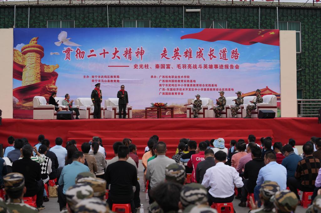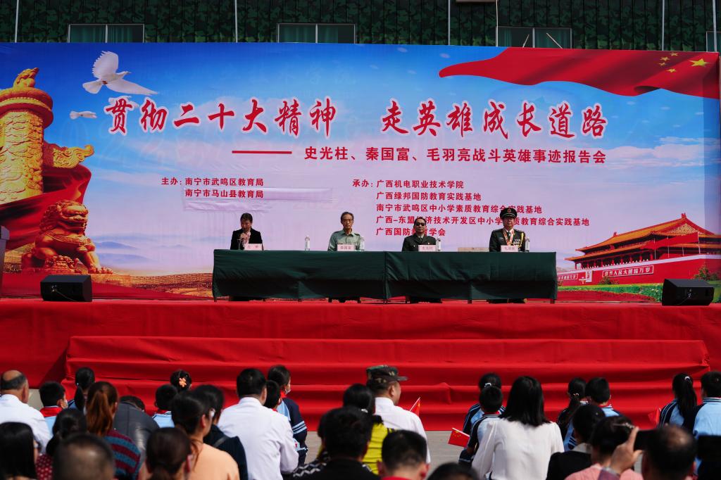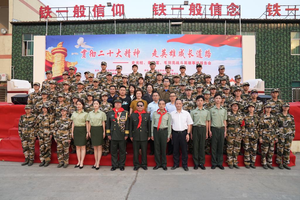 为深入学习贯彻党的二十大精神,在师生中开展崇尚英雄、学习英雄教育活动,增进师生爱国情、报国志,传承和弘扬英雄精神,3月10日,由万象城官网承办的“贯彻党的二十大精神 走英雄成长道路”英模事迹报告会在广西绿邦国防教育实践基地举行。国家一级战斗英雄史光柱、秦国富,战斗英雄毛羽亮分别作报告。学校党委副书记陈科鹤与在基地军训的学生现场聆听报告会,广大师生在相思湖和思源湖校区通过观看直播的形式参加报告会。