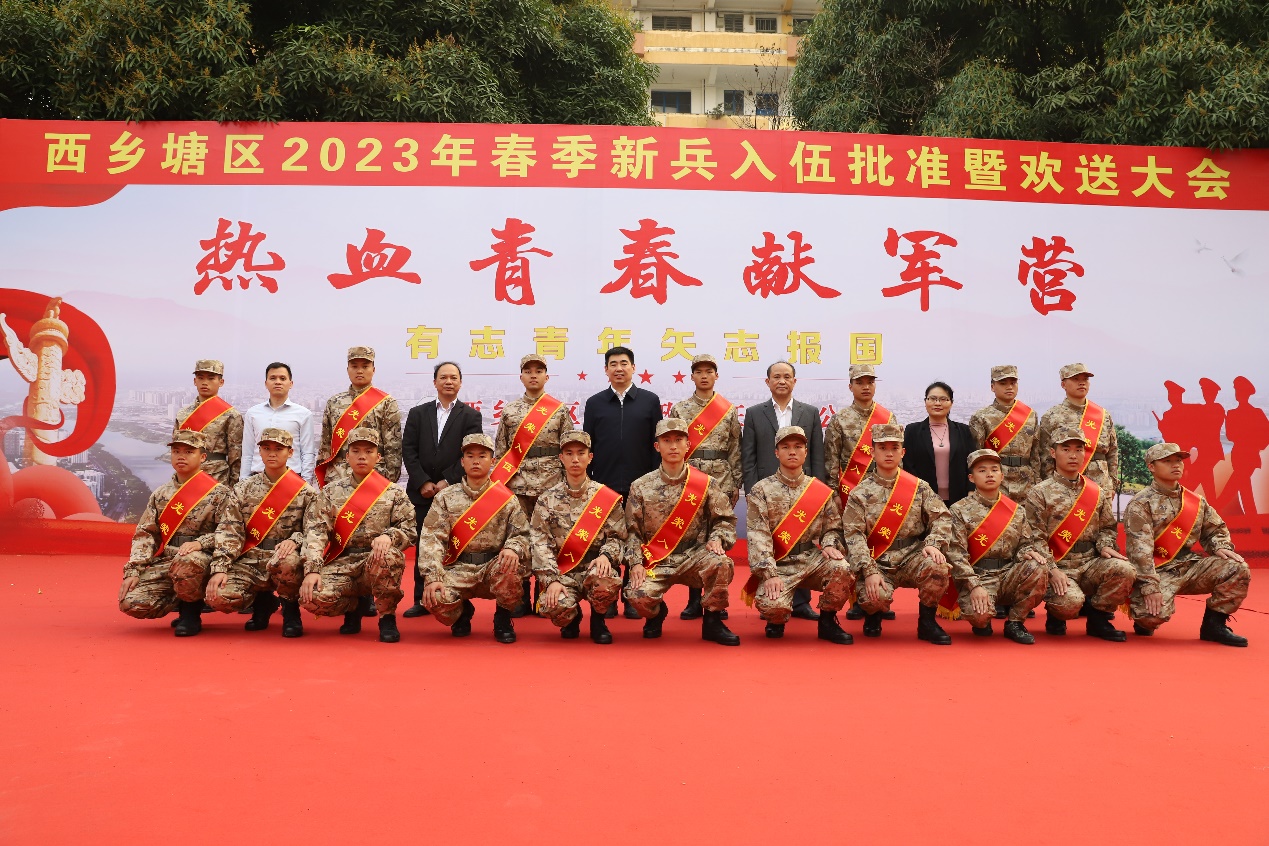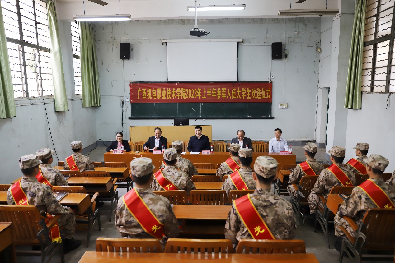 3月14日下午,万象城官网在南宁市西乡塘区役前训练基地举行2023年春季应征入伍大学生欢送会,为即将踏上军旅征程的19位新入伍学生送行。学校党委书记黄小敬出席欢送会,党委副书记陈科鹤主持会议。