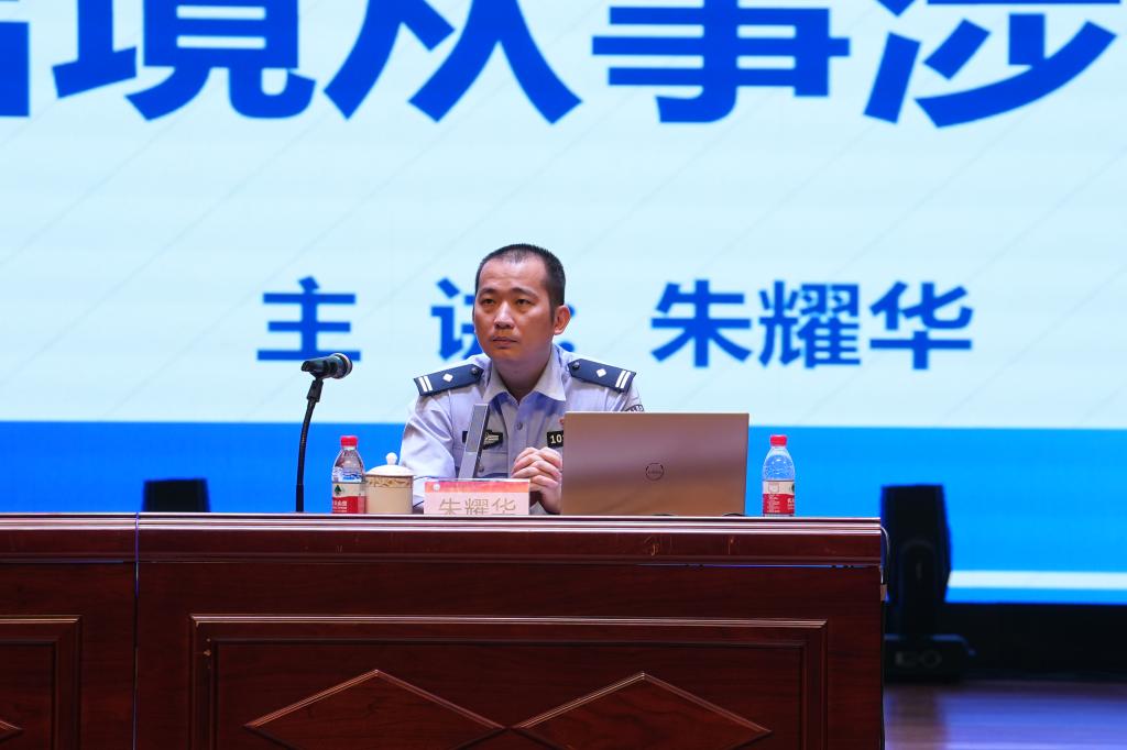 讲座培训会上,南宁市公安局巡警反诈支队五大队大队长朱耀华作题为《防范电信网络诈骗、涉两卡违法犯罪、出境从事涉诈违法犯罪》的讲座。他首先引用新闻媒体的相关报道,系统地介绍了电信网络诈骗的定义和危害。随后他讲述了发生在大学生身边最为常见的诈骗类型,列举近期高发的诈骗案例,讲解诈骗分子作案手段,详细剖析了识别技巧、防范措施,加强师生对于诈骗案件的辨识。