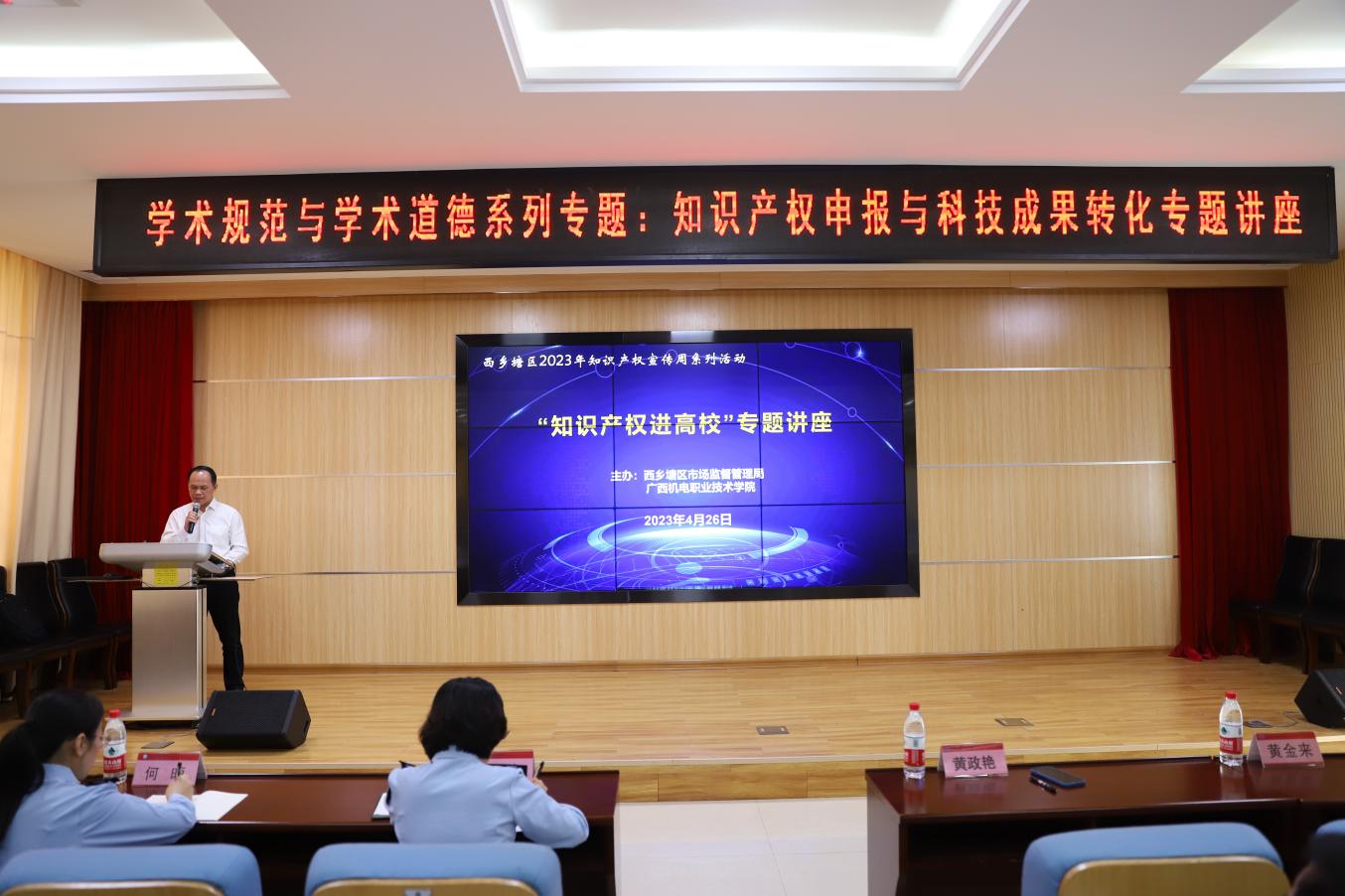 4月26日,万象城官网联合西乡塘区市场监督管理局举办了学术规范与学术道德系列专题的第一个讲座:知识产权申报与科技成果转化专题。讲座由桂林电子科技大学周治德教授主讲,万象城官网黄政艳副校长主持。万象城官网师生代表及西乡塘区市场监督管理局职工代表共200多人聆听了本次讲座。