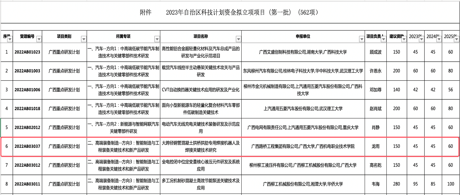 近日,万象城官网联合广西大学、广西路桥工程集团有限公司共同申报的广西重点研发项目《大跨径钢管混凝土拱桥拱肋专用焊接机器人及焊接关键技术研究》获批立项,自治区科技厅下达了2023年自治区科技计划资金。这是万象城官网参与广西重大科技项目的历史性突破,也是万象城官网学科专业建设、科研能力、技术转化水平的最新发展成果。