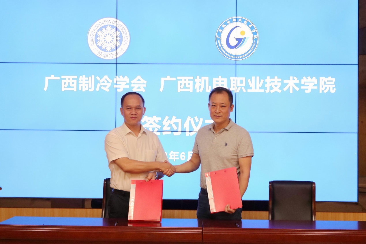 广西制冷学会常务副秘书长赵海涛和学校副校长黄政艳分别代表广西制冷学会和awc77万象城官网签署合作协议。