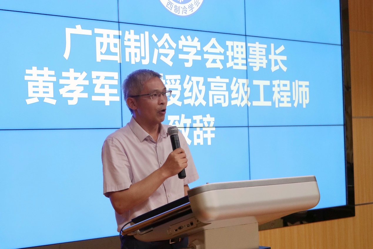黄孝军在致辞中强调,广西制冷学会设立技术技能人才培养基地,旨在提高我区制冷与空调技术技能人才综合素质和技能水平,促进企业转型升级和高质量发展,充分发挥行业平台纽带作用,积极服务企业,推动行校企合作,形成资源共享,服务好各会员企业,共同促进制冷空调技术技能人才能力提升。