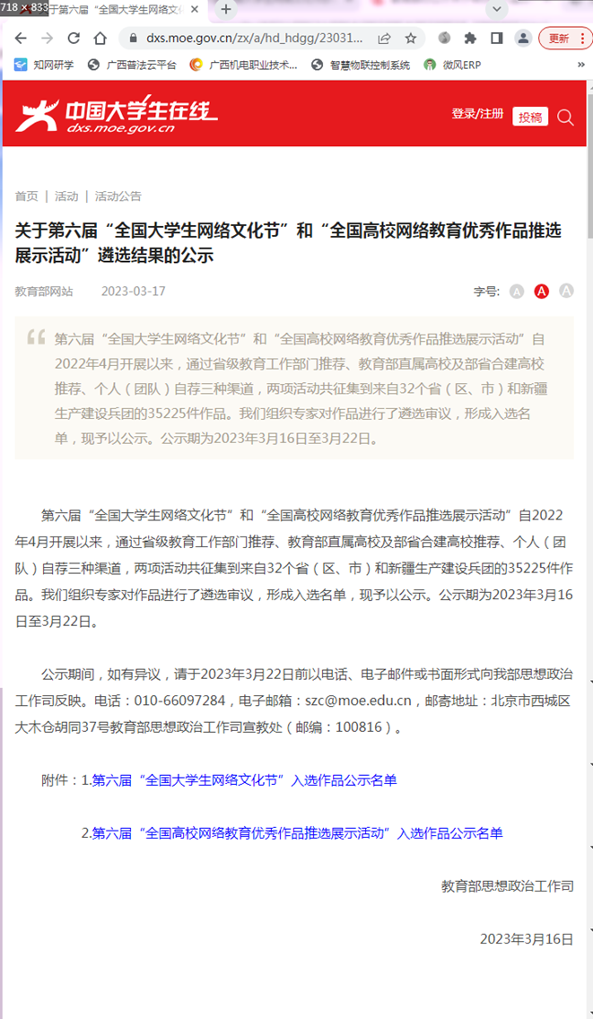 据悉,作为全国高校网络思政领域最高级别竞赛之一,第六届全国大学生网络文化节和全国高校网络教育优秀作品推选展示活动由教育部思想政治工作司和中央网信办网络社会工作局联合举办,以“争做校园好网民,凝集网络正能量,青春献礼二十大”为活动主题。