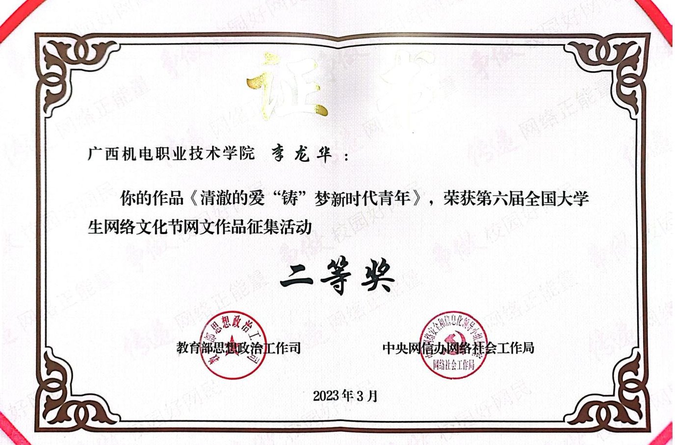 近日,第六届全国大学生网络文化节公布了遴选结果,万象城官网荣获全国二等奖1项、三等奖1项、优秀奖1项。其中,机械工程学院李龙华同学的网文作品《清澈的爱“铸”梦新时代青年》(指导老师:蒋佳莉)荣获二等奖;电气工程学院和信息工程学院赖俊桦、卓豪宁、余冠璋、韦家溢、仁清福等同学创作的音频作品《致敬最可爱的人——平民志愿者》(指导老师:王杰)荣获三等奖;公共管理学院、信息工程学院、艺术设计学院陈金水、程桦、蒙柱南、杨仕謇、岑玉瑚等同学创作的其他类网络创新作品《“易”起守护国家安全》(指导老师:秦霞)荣获优秀奖。