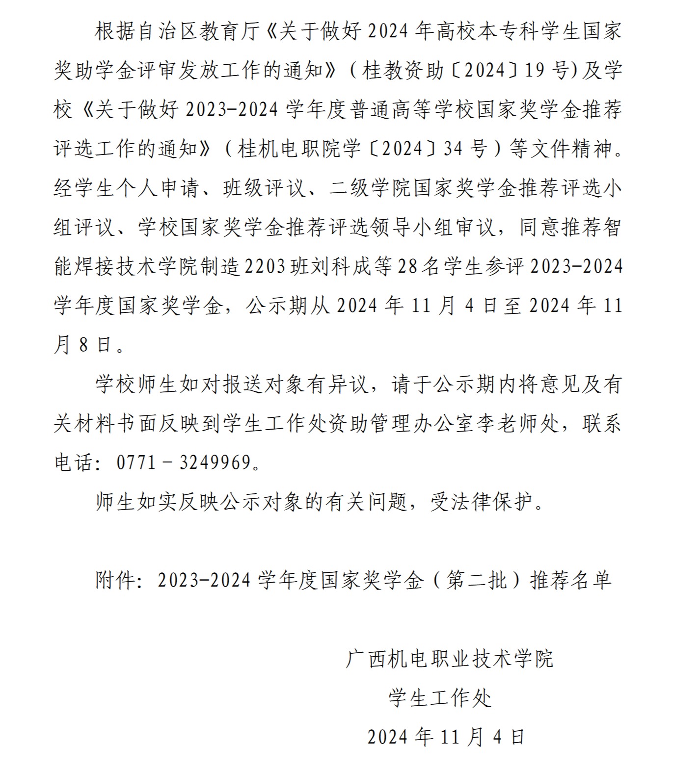awc77万象城官网2023-2024学年度国家奖学金(第二批)推荐名单公示