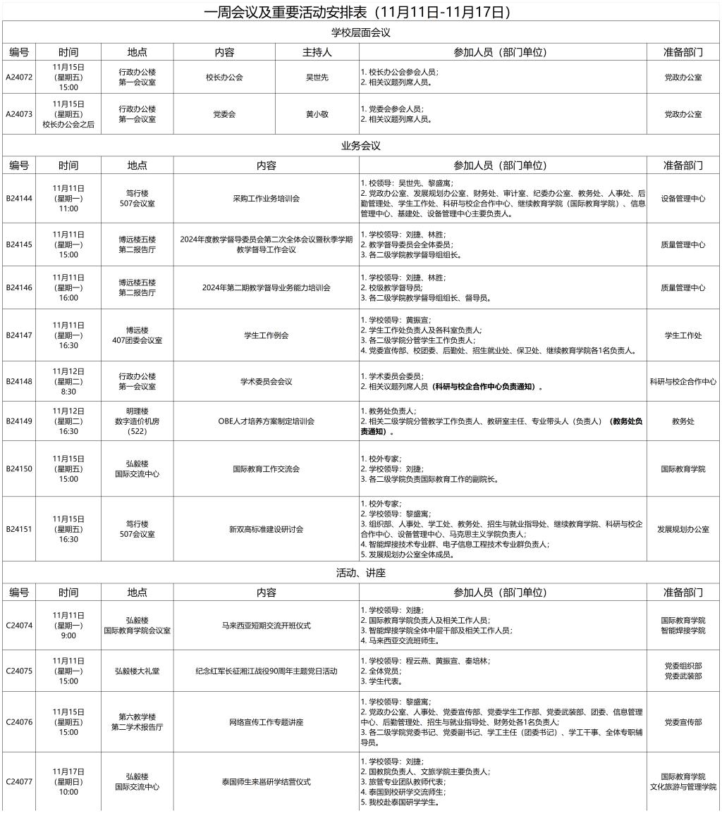 一周会议及重要活动安排表(11月11日-11月17日)
