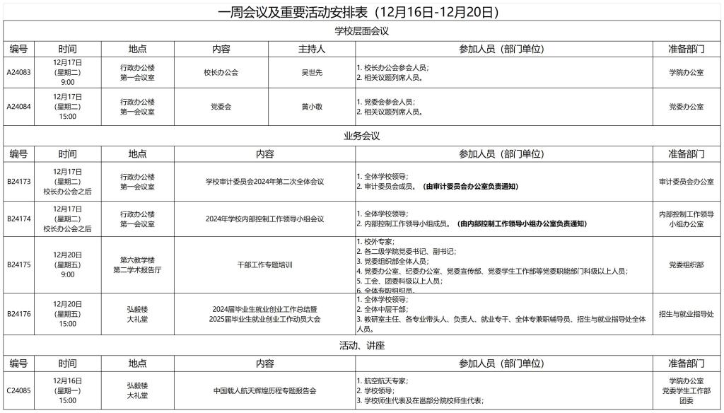 一周会议及重要活动安排表(12月16日-12月20日)