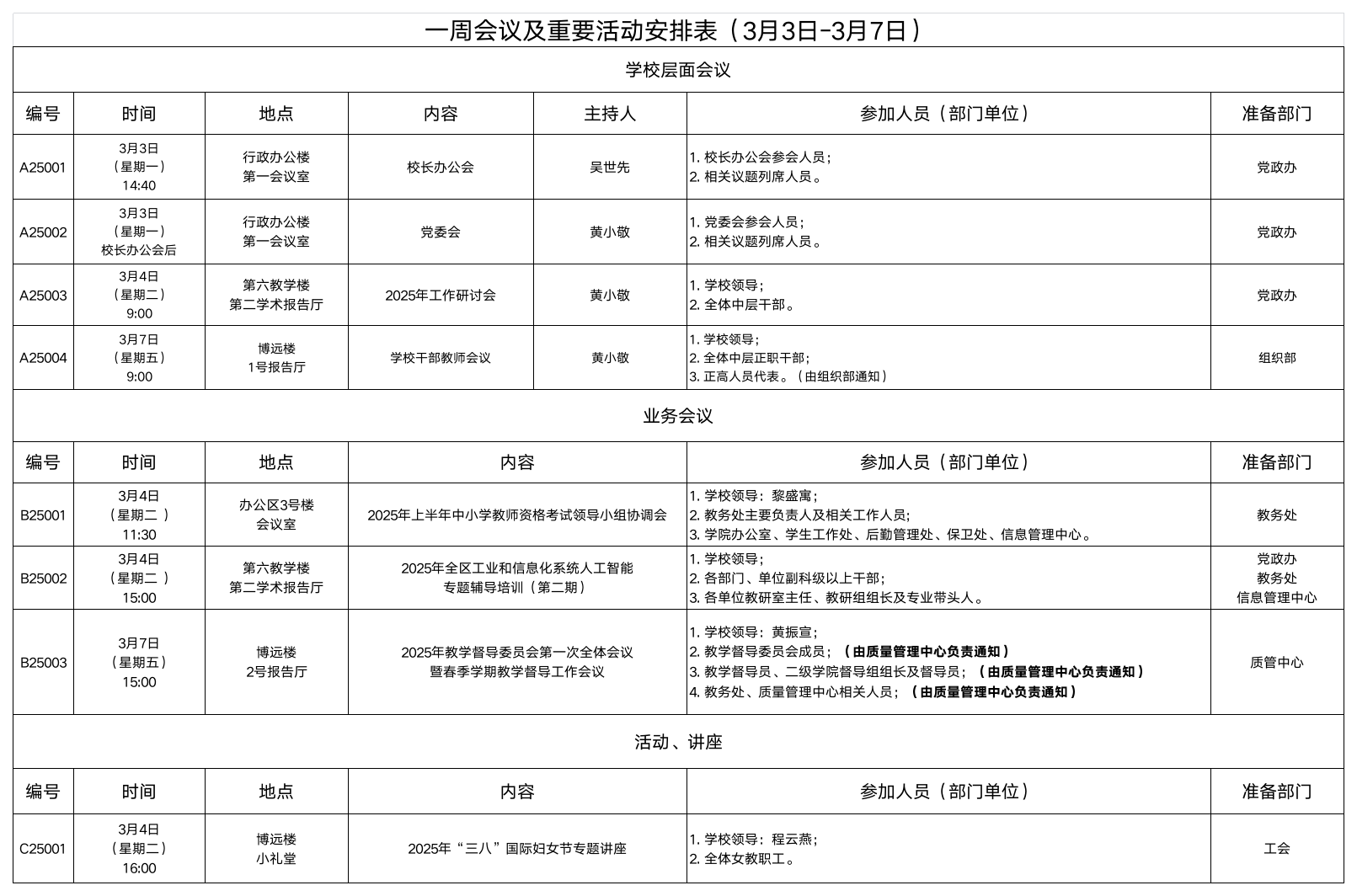 一周会议及重要活动安排表(3月3日-3月7日)