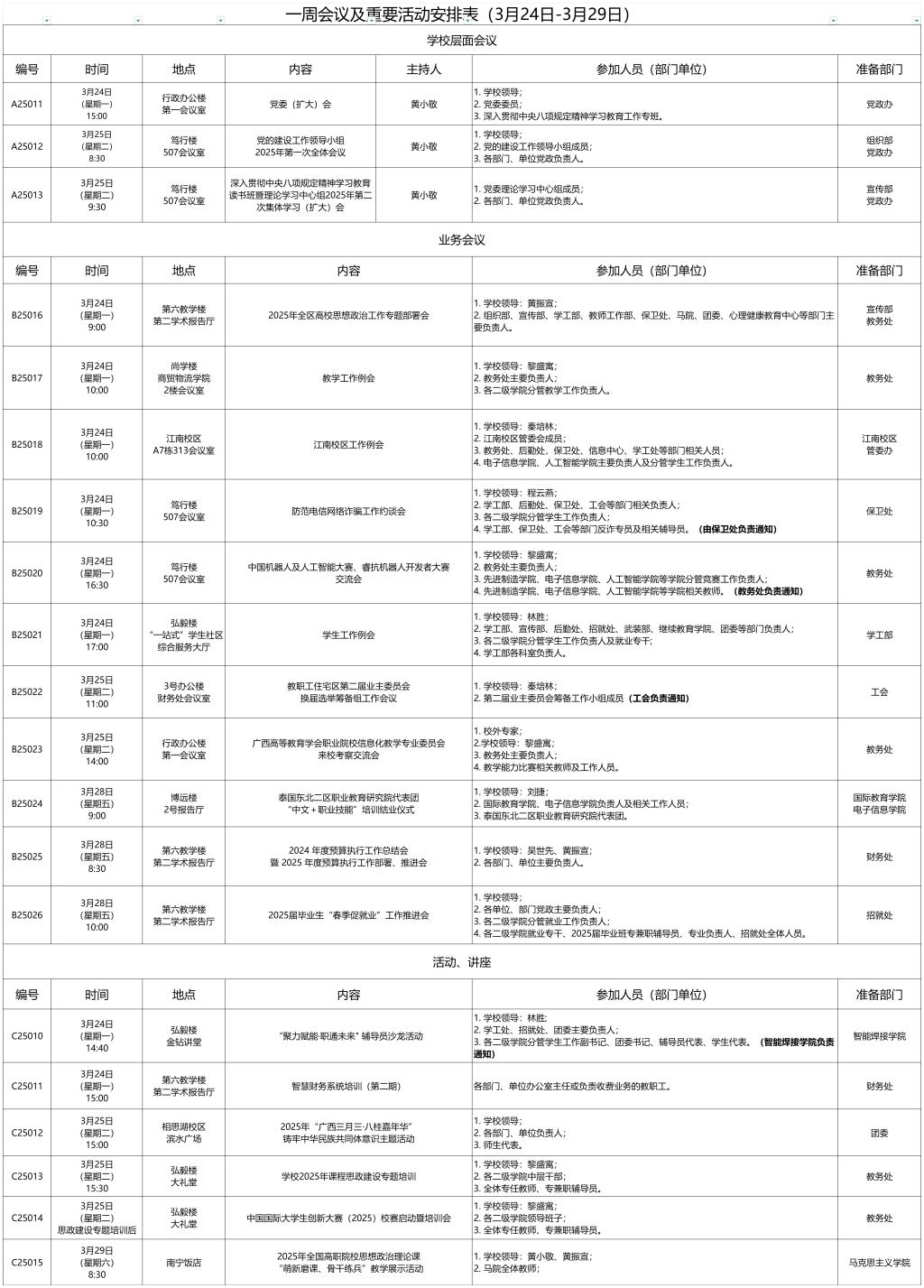 一周会议及重要活动安排表(3月24日-3月29日)