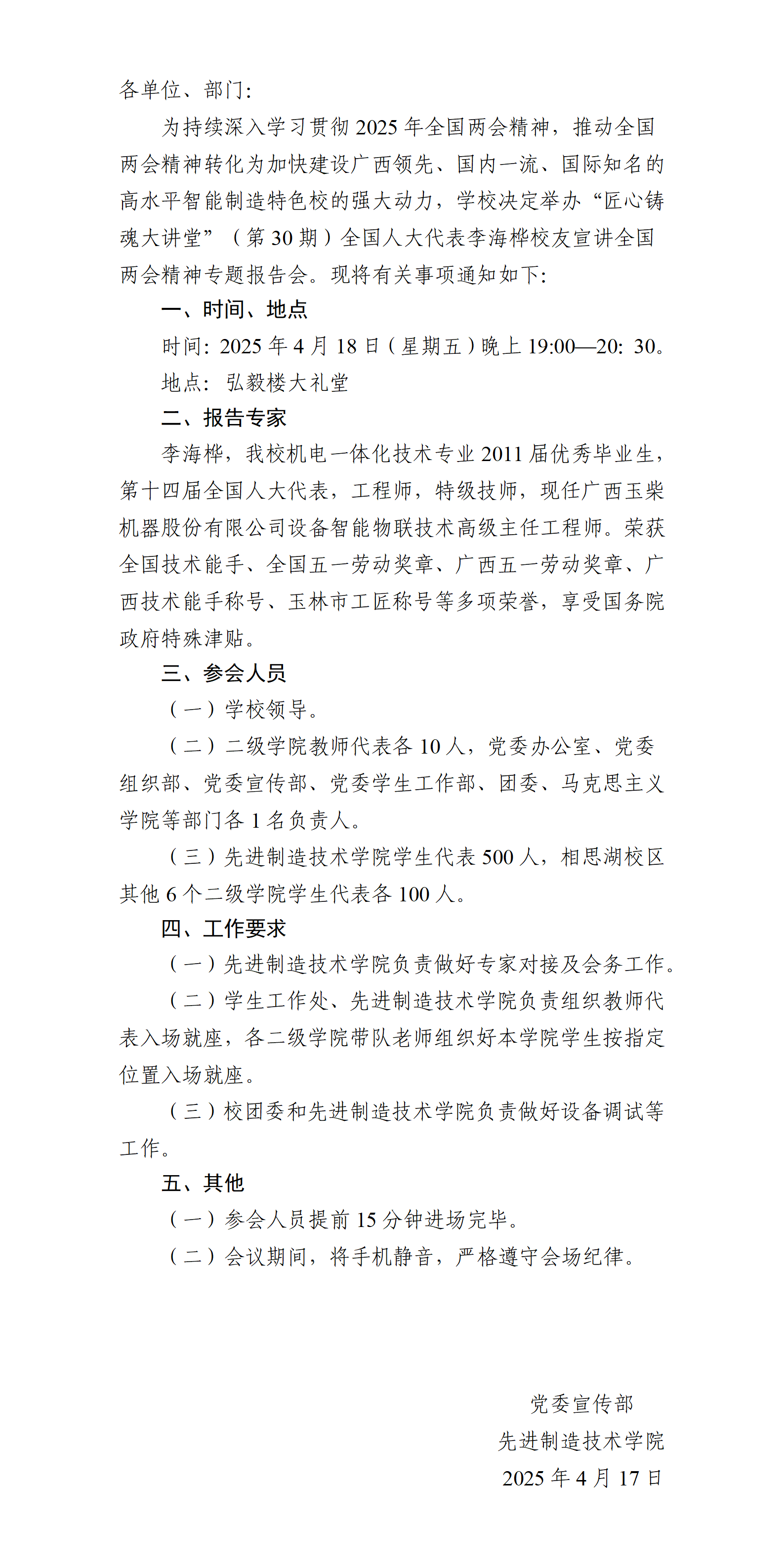 关于举办“匠心铸魂大讲堂”(第30期)全国人大代表 李海桦校友宣讲全国两会精神专题报告会的通知