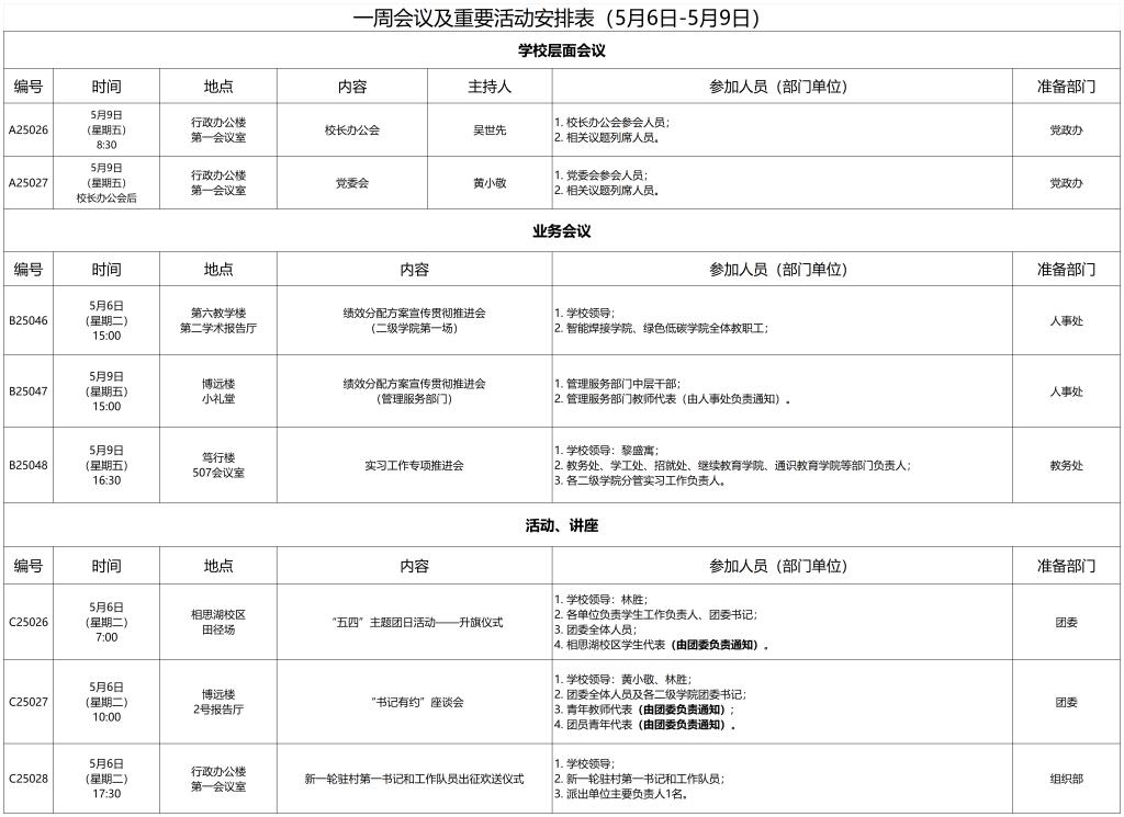 一周会议及重要活动安排表(5月6日-5月9日)