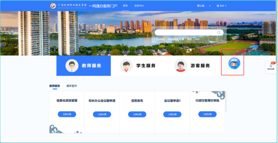 在浏览器中打开学校一网通办服务门户网址:https://nportal.gxcme.edu.cn/default/index.html#/点击桌面的AI小助手,进入AI问答界面,在输入框处找到AI辅导员并点击进入。