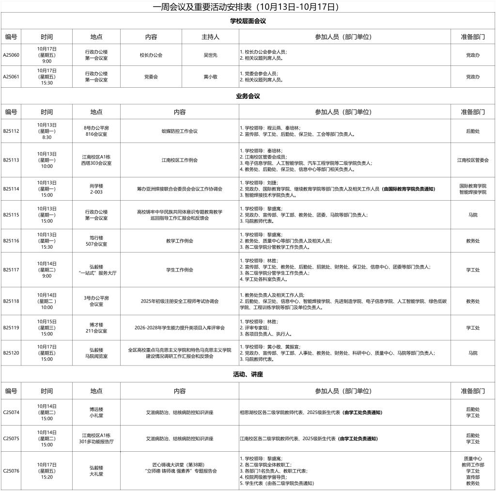 一周会议及重要活动安排表(10月13日-10月17日)
