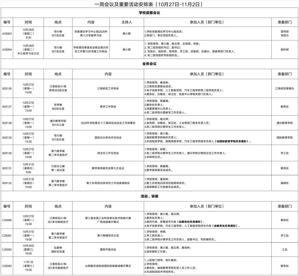 一周会议及重要活动安排表(10月27日-11月2日)