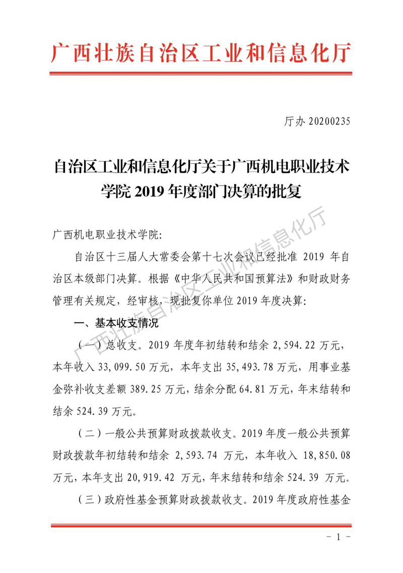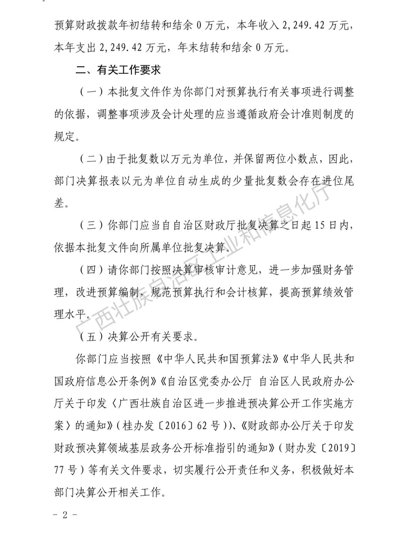 自治区工业和信息化厅关于awc77万象城官网2019年度部门决算的批复
