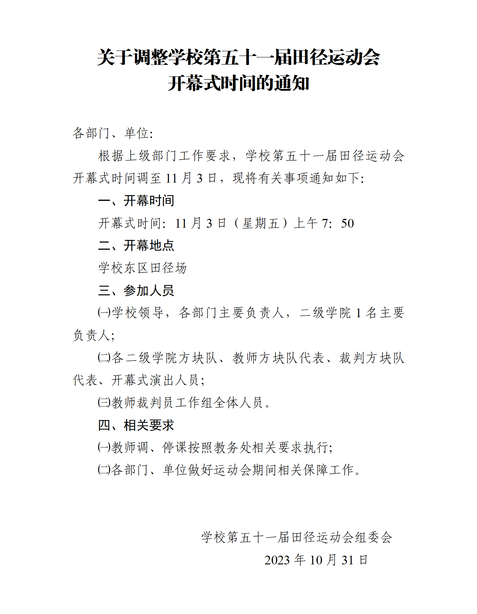 关于调整第五十一届田径运动会举开幕式时间的通知